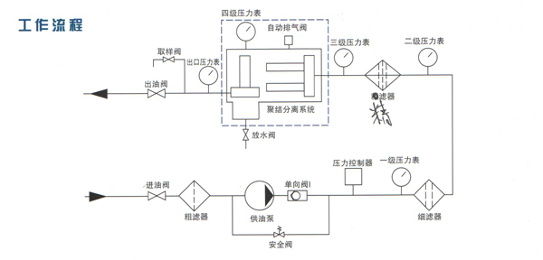 未及時(shí)沉降下來(lái)的水繼續(xù)隨油液前行,在通過(guò)分離元件時(shí),由于分離元件表層噴涂有高分子材料,對(duì)水有強(qiáng)大的排斥作用,因此可把水?dāng)r于分離元件之外,使之不能通過(guò)分離元件,水自然沉降到蓄水池內(nèi),從分離元件流出的油就是凈油,這就完成了對(duì)油凈化的全過(guò)程。蓄水池內(nèi)的水通過(guò)自動(dòng)排水裝置排出。