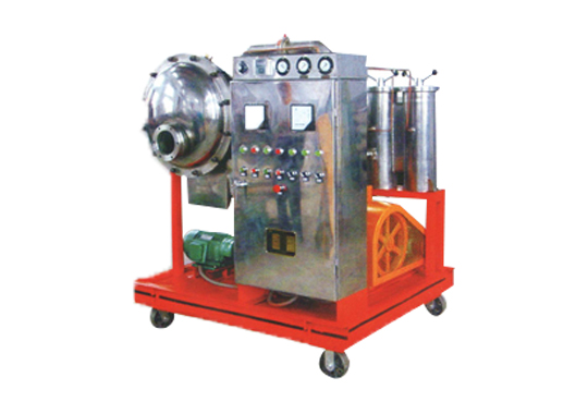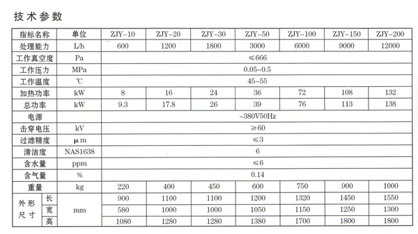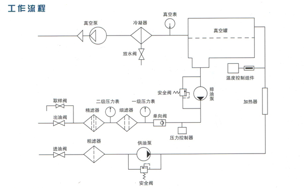 油液在供油泵的作用下首先由進油口進入粗濾器,通過粗濾器除去油中較大雜質(zhì)后經(jīng)過加熱器時被加熱55℃左右,加熱后的油液首先通過真空罐內(nèi)的脫氣元件噴射到真空罐內(nèi),在真空狀態(tài)下,水份會低溫沸騰而變成水蒸氣,然后被真空泵抽出,被抽出的水蒸氣在通過冷凝器時大部分被冷凝成水,小部分通過真空排氣口排出。經(jīng)過脫氣、脫水后的油液在排油泵的驅(qū)動下經(jīng)過細濾器和精濾器除去油中殘余雜質(zhì)后由出油口排出,完成整個處理過程